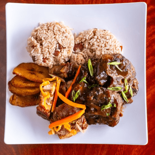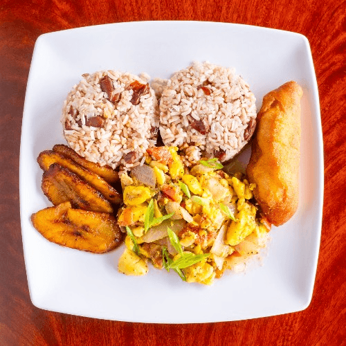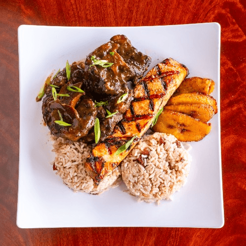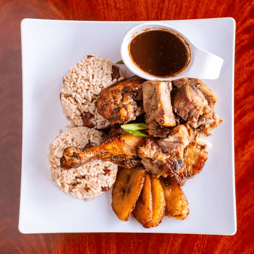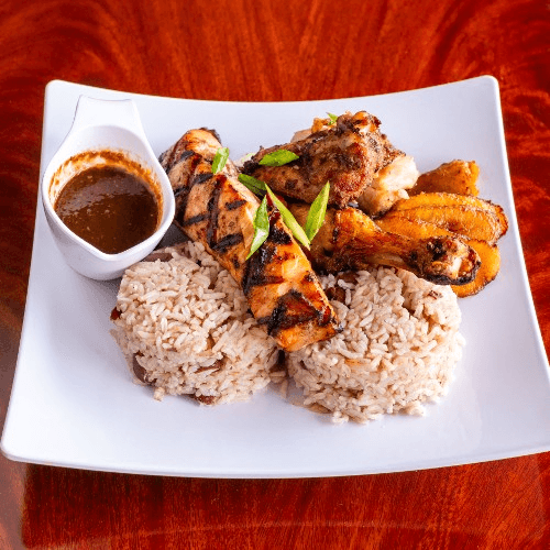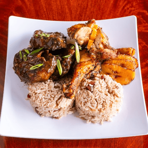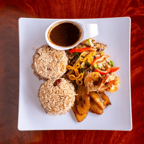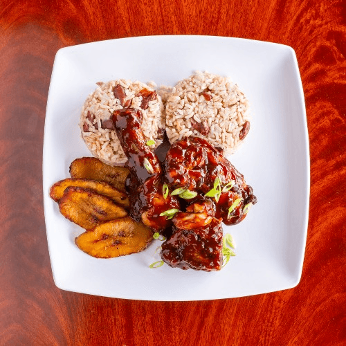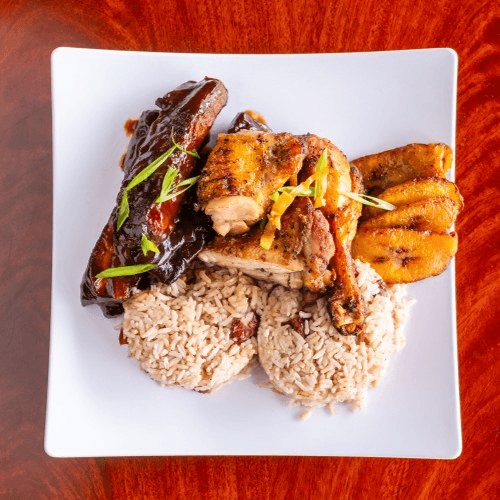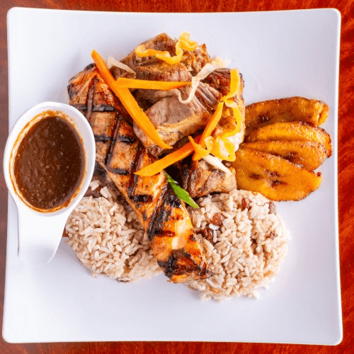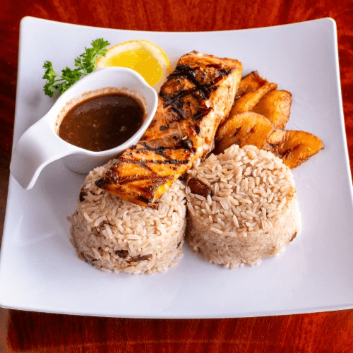 Served with coleslaw and choice of French fries, rice and beans or macaroni and cheese. Served with plantain