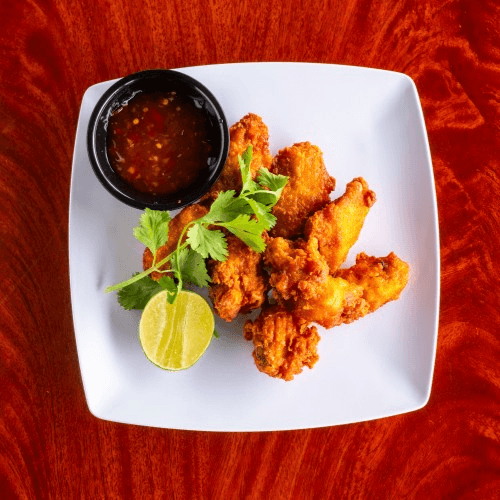 8 pieces. Marinated chicken wings grilled with mango dipping sauce