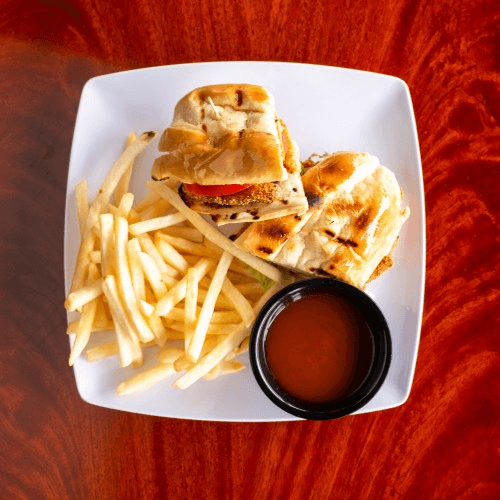 With lettuce, tomato, and tartar sauce. Served with a side of fries or salad.