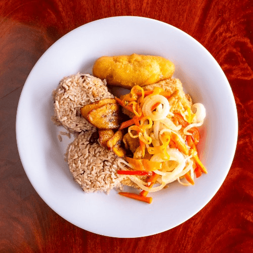 Pan-fried fish filet with pickled onion, carrots, vinegar and spices in a savory and spicy sauce. Served with rice, beans, corn festival and plantains