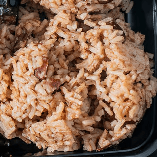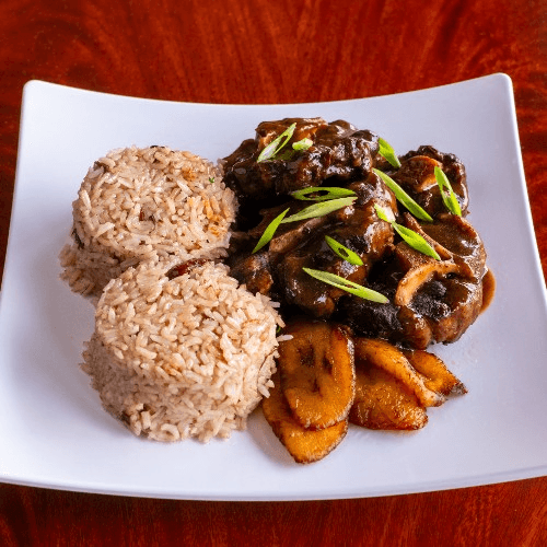 Served with rice, beans and plantains